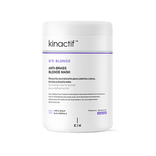 La Kinactif Anti Brass Blonde 2-In-1 Mask 900 ml esta pensada para tratar intensamente cabellos rubios, blancos y decolorados que necesitan mantener un rubio frio y luminoso entre servicios tecnicos. Esta mascarilla actua como refuerzo del matiz cuando el cabello empieza a virar hacia reflejos amarillos, y ayuda a recuperar un tono mas limpio, con mejor brillo y un acabado mas pulido desde la primera aplicacion.